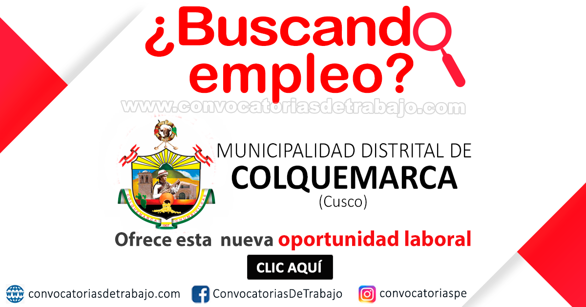 Ingresa a cada convocatoria, descarga las bases del puesto que te interesa cubrir, informate y postula a esta esta importante institución del sector público: MUNICIPALIDAD DISTRITAL DE COLQUEMARCA