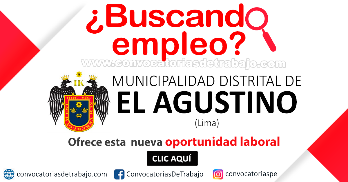 Cuando esta entidad(MUNICIPALIDAD DISTRITAL DE EL AGUSTINO) requiera nuevo personal, publicaremos sus convocatorias por este medio.
