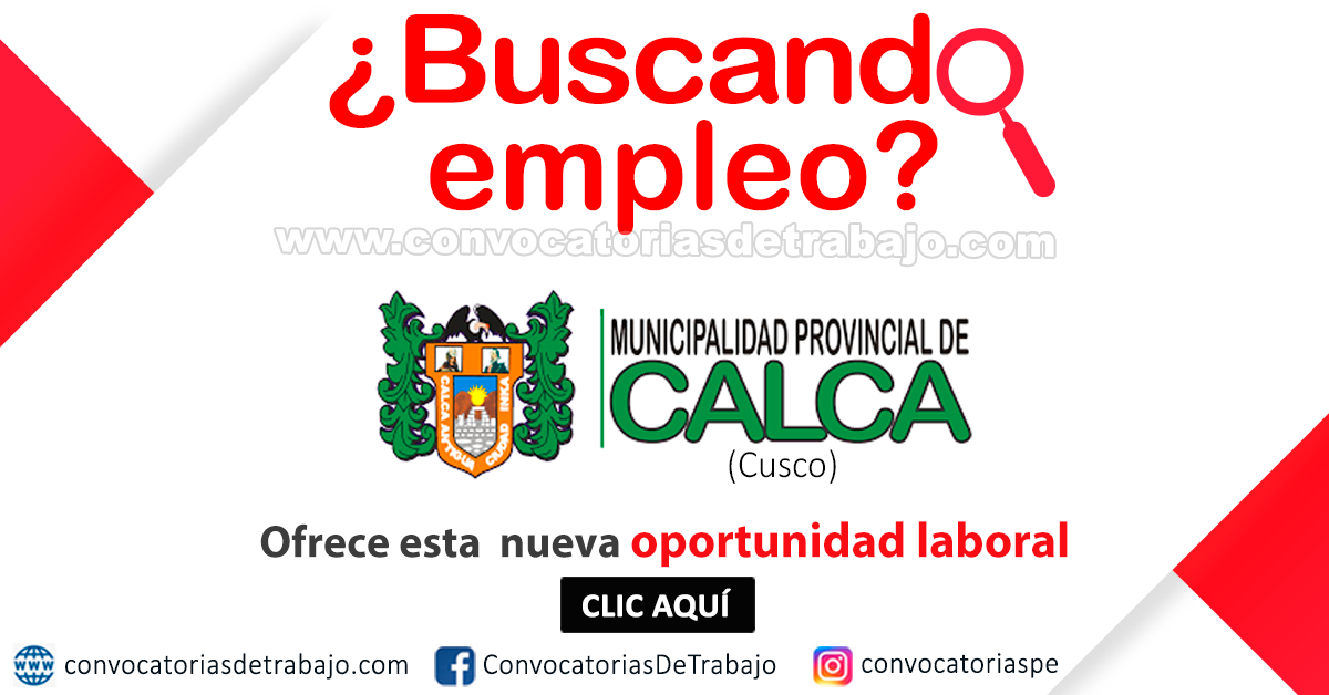 A través de esta plataforma te informaremos sobre los procesos de selección de personal de esta institución del Gobierno Peruano (MUNICIPALIDAD PROVINCIAL DE CALCA). Tendrás información actualizada de las últimas oportunidades laborales con las correspondientes bases de cada proceso.